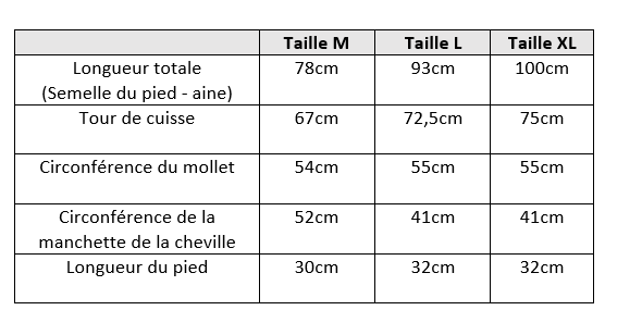 Bonjour, Le tour de cuisse max (pour la taille XL) est de 75cm. Cordialement.
